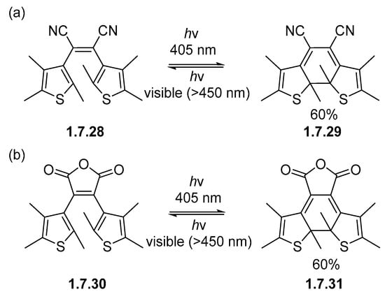 - Lucas, L.N.; Esch, J.v.; Kellogg, R.M.; Feringa, B.L. A New Class of Photochromic 1,2-Diarylethenes; Synthesis and Switching Properties of Bis(3-Thienyl)Cyclopentenes. Chem. Commun. 1998, 2313–2314. [Google Scholar] [CrossRef]