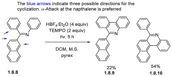 - Kos, M.; Žádný, J.; Storch, J.; Církva, V.; Cuřínová, P.; Sýkora, J.; Císařová, I.; Kuriakose, F.; Alabugin, I.V. Oxidative Photocyclization of Aromatic Schiff Bases in Synthesis of Phenanthridines and Other Aza-PAHs. Int. J. Mol. Sci. 2020, 21, 5868. [Google Scholar] [CrossRef] [PubMed]