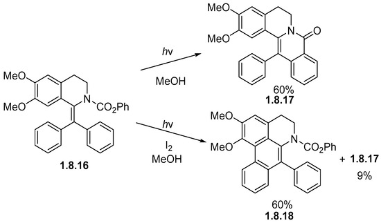 Another interesting example is the cyclization of vinylene carbonate 1.1.6, which yields phenanthrene 1.1.7 (Scheme 6a) in a 77% yield with I2 in cyclohexane and a 13% yield with O2 in EtOH, while its dimethoxy substituted counterpart 1.1.8 produces 1.1.9 at 50% upon irradiation in the presence of I2 (Scheme 6b) [51].