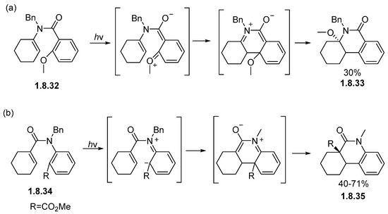 - Ninomiya, I.; Naito, T.; Kiguchi, T. Photocyclisation of Enamides. Part III. Photocyclisation of N-Benzoylenamines of Cyclohexanone and 2-Substituted Cyclohexanones. J. Chem. Soc. Perkin Trans. 1 1973, 2257–2261. [Google Scholar] [CrossRef]