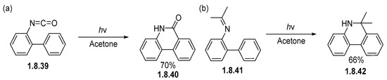 Since the dihydrophenanthrene intermediate is quite unstable and can open back into the starting stilbene, the non-oxidative photocyclization has to be made irreversible by subsequent steps [37,38]. For example, a series of 1,3-H shifts can give a partially aromatized product with biphenyl moieties incorporated into the tricyclic core [52]. These transformations require suitable groups at the C-9 and/or C-10 positions of the starting stilbene. Such groups include electron-deficient carbonyl or cyano substituents. For example, we can cite the conversion of dinitrile 1.1.34 to trans-9,10-dicyano-9,10-dihydrophenanthrene 1.1.35 [66,67] (Scheme 12a) and diphenylmaleic anhydride 1.1.36 to anhydride 1.1.37 (Scheme 12b) [66].