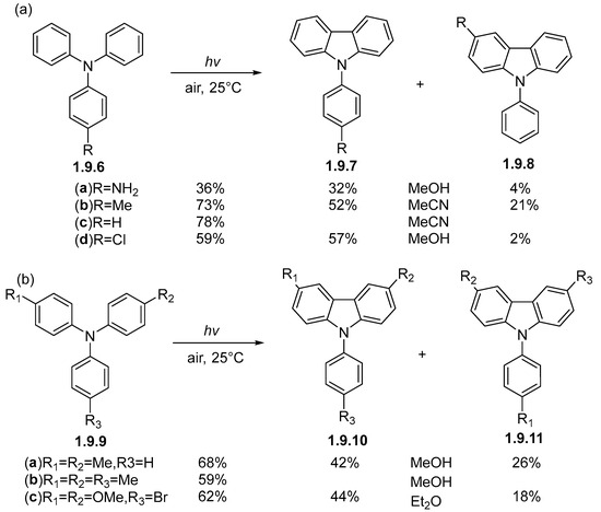 - Romero, I.E.; Postigo, A.; Bonesi, S.M. Solvent Effects on the Photoinduced [6π]-Electrocyclization Reactions of Mono-, Di-, and Trisubstituted Arylamines: Photophysical, Preparative Photochemistry, and Mechanistic Investigations. J. Org. Chem. 2023, 88, 4405–4421. [Google Scholar] [CrossRef] [PubMed]