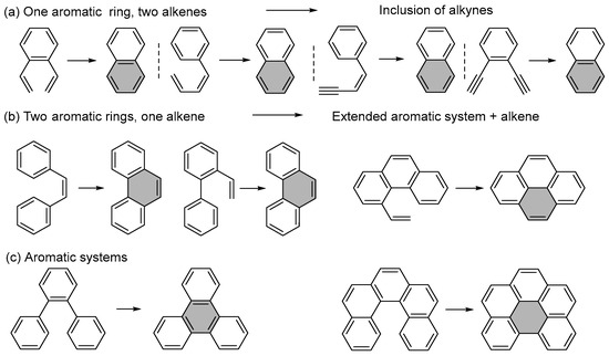 - Gonzalez-Rodriguez, E.; Abdo, M.A.; dos Passos Gomes, G.; Ayad, S.; White, F.D.; Tsvetkov, N.P.; Hanson, K.; Alabugin, I.V. Twofold π-Extension of Polyarenes via Double and Triple Radical Alkyne Peri-Annulations: Radical Cascades Converging on the Same Aromatic Core. J. Am. Chem. Soc. 2020, 142, 8352–8366. [Google Scholar] [CrossRef]