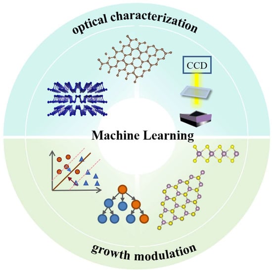 After obtaining optical images or spectral information through optical techniques, subsequent data processing is also very important for detecting the optical properties of 2D materials. The traditional method, based on experience, relies heavily on the expertise of the researcher, is influenced by subjective factors, and has disadvantages such as low accuracy, poor consistency, low efficiency, and high labor intensity. The introduction of machine learning techniques has opened up entirely new avenues for exploring the optical properties of 2D materials, significantly changing the research landscape in this field [10,11,12]. By constructing a material database and combining it with advanced machine learning algorithms, the structural and optical properties of 2D materials can be effectively predicted, and suitable experimental conditions can be screened for them to regulate growth patterns. With the help of machine learning technology, scientists can explore the diverse properties of 2D materials in terms of spectral response, light absorption, luminescence properties, and photovoltaic conversion efficiency with unprecedented ease, laying a solid foundation for the design and development of new photovoltaic materials [13,14,15].
