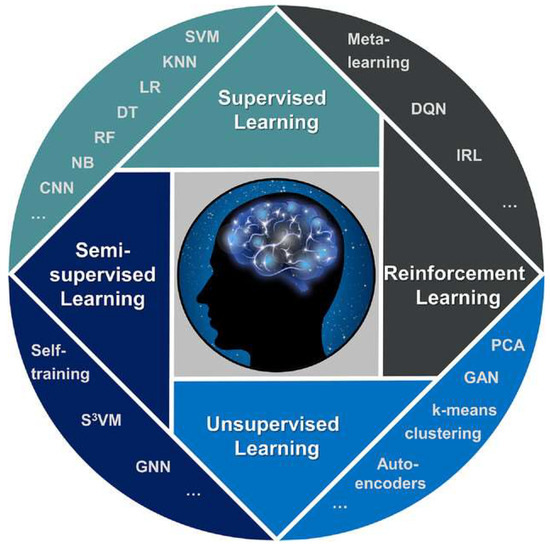 Many algorithms that implement machine learning are based on statistical principles [22,23]. Depending on the training model, different learning methods can categorize machine learning (ML) into supervised, unsupervised, semi-supervised, and reinforcement learning. A brief overview of some typical ML algorithms is given in Figure 2. In supervised learning, the input data is considered “training data”, and each set of training data has a specific identification or result. In unsupervised learning, the data is not specifically labeled, and the algorithmic model infers the internal structure of the data. Semi-supervised learning has some of the input data identified and some unidentified and can be used for prediction. Reinforcement learning has the input data fed directly into the training model, and the model is adjusted in time. When data is entered into a computer, a general algorithm uses the data to perform calculations and then outputs the results [24,25]. The major difference with the general algorithm is that the inputs of the ML algorithm are the data and the desired result, and the output is the successful fuzzy algorithmic model, which converts the data into a result. Through machine learning, computers can generate their models and then provide relevant judgments to predict outcomes [26,27,28,29,30].