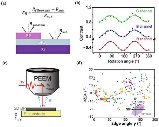(a) Schematic of the optical contrast calculation. Ref. [115] with permission from American Chemical Society, copyright 2016. (b) Optical contrast of the few-layer BP measured in the RGB channel as a function of rotation angle. Ref. [115] with permission from American Chemical Society, copyright 2016. (c) Schematic of NNI PEEM. Ref. [116] with permission from American Chemical Society, copyright 2022. (d) Average phase shift ⟨δβ⟩ as a function of edge orientation γ, shown schematically in the inset, for five different black phosphorus flakes (use different colors to differentiate). Ref. [116] with permission from American Chemical Society, copyright 2022.