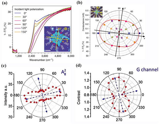 In 2014, Xia et al. reintroduced BP as an anisotropic material with a narrow bandgap and high carrier mobility into the family of layered materials [84]. The x and y orientations of BP thin films were independently determined using angle-resolved DC conductivity measurements. For BP films thicker than 8 nm, flakes with lateral dimensions of tens of micrometers can be isolated, allowing the direction of crystallization to be determined using infrared spectroscopy. The lower right inset of Figure 5a shows an optical image of a BP flake with a thickness of about 30 nm. We measured the IR polarization-resolved relative extinction spectra (1–T/T0), where T and T0 are the transmittance of light through the BP and substrate and the substrate only, respectively. Figure 5a represents the 1–T/T0 measured on the BP with incident light coming from the Z direction at six different linear polarization angles, each separated by 30 degrees, which are represented by six arrow lines of different colors in the inset. In this experiment, 12 electrodes (1 nm Ti/20 nm Pd/30 nm Au) were fabricated on the same thin film. The electrodes were spaced at an angle of 30° along the direction shown in the inset of Figure 5b, which corresponds to the direction shown by the colored lines in Figure 5a. The same 0° reference is used here for the polarization-resolved IR spectroscopy measurements in Figure 5a. These DC conductivity measurements were performed by applying an electric field to each pair of diagonally positioned electrodes, which were 22 mm apart at 180°. The results are plotted in polar coordinates in Figure 5b. Measurements on each pair of electrodes resulted in two data points, positively biased and negatively biased, spaced 180° apart in Figure 5b. BP bridges the energy gap between semimetallic graphene and a variety of large-bandgap transition metal dichalcogenides (TMDCs), making the BP films ideal candidates for a wide variety of near- and mid-infrared photovoltaic applications, such as photodetectors and modulators.