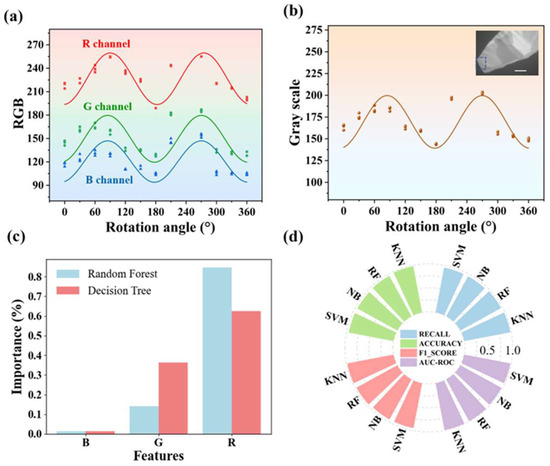 Sample image processing. (a) Variation of the RGB value of the area marked by the red box of the optical image for the rotation angle. (b) Variation relationship of gray value with rotation angle for the blue box-marked region of the grayscale image. The inset shows a single-channel separated grayscale image (40 μm in scale). (c) Feature importance analysis based on RF and decision tree models. (d) Comparison of the performance of RF, SVM, KNN, and NB models (The closer to 1 means better performance). Ref. [132] with permission from American Chemical Society, copyright 2024.