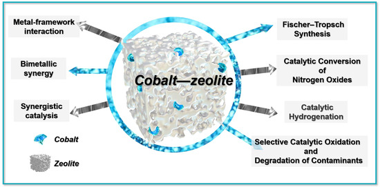 This review endeavors to present a comprehensive summary of cobalt–zeolite composite catalysts. We focused on the synthesis of catalysts and the morphology of cobalt and the synergistic effect of metal–framework interaction and bimetallic/multi-metallic in cobalt–zeolite composite catalysts. Next, the practical applications and catalytic performance study of cobalt–zeolite are reviewed (Figure 1). Following a summary of the advancements and challenges in potential applications, we offer a perspective on the future of cobalt–zeolite.