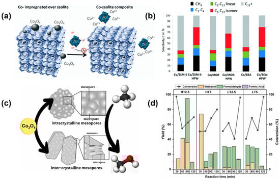 (a) HPA extraction procedure for the synthesis of metal–zeolite composite material containing metal species only in the zeolite pores. (b) Selectivity (%) to hydrocarbons during FTS over cobalt–zeolite catalysts. Reproduced from Ref. [59]. Copyright 2017, Royal Society of Chemistry. (c) Synthesis of hierarchical Co3O4/ZSM-5. (d) Catalytic activity (%) in methane partial oxidation of –3O4/ZSM-5. Reproduced from Ref. [60]. Copyright 2024, Elsevier.
