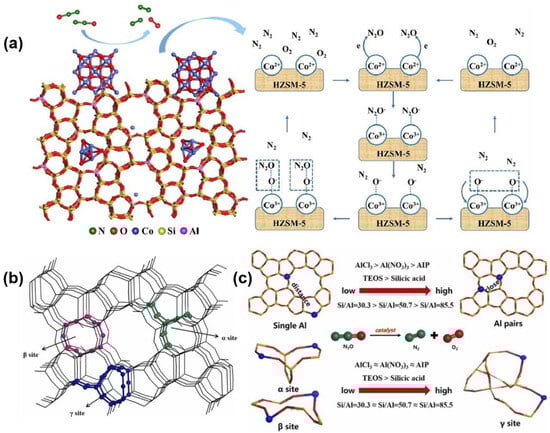 Building upon prior research, an increasing number of modified cobalt–zeolite catalysts have been developed and examined. These advancements have effectively addressed the existing gaps in the underlying mechanisms. Li et al. successfully synthesized cobalt-incorporated HZSM-5 catalysts, where multiple cobalt species were identified and demonstrated cooperative catalysis in N2O decomposition [79]. Co2+ ions in cobalt species are regarded as active sites in N2O decomposition. Kang et al. synthesized a series of ZSM-5 zeolites with diverse contents and locations of Al pairs, in which Co2+ ions were subsequently anchored at the Al pairs by wet ion-exchange with H protons [80]. They found that the dissociation performance of N2O improved as more Al pairs coordinated with either protons or cobalt ions. Furthermore, the energy barrier required to overcome for O2 desorption at the γ-site Co2+ of ZSM-5 zeolite was less than that at the β-site (Figure 4).