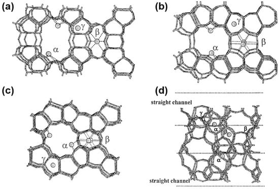 Suggested cationic sites of the α-, β-, and γ -type Co ions in (a) MOR, (b) FER, and (c,d) MFI structures; (c) view through the straight channel and (d) view through the sinusoidal channel, straight channel indicated by dashed lines. Reproduced from Ref. [101]. Copyright 2000, Elsevier.