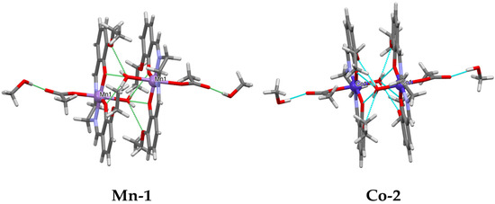The bond parameters of Mn-1 and Co-2 are unexceptional and well comparable to those reported [31,32,33,34,35,36,37,38,39,40,41]. In both structures, the M–Osalen bond lengths are significantly shorter than the M–Oaxial bonds, indicating a stronger chelating interaction between the metal ion and the salen ligand. For both complexes, the pendant ethoxyl-O atoms remain uncoordinated; instead, they behave as hydrogen-bond acceptors for the formation of hydrogen-bonded dimers between two centrosymmetric molecules of the complex (Figure 2). Specifically, the axially coordinated water molecule of one complex acts as a hydrogen bond donor to form two pairs of bifurcated hydrogen bonds with the O4 cavity of the salen ligand in the second molecule. In addition, the crystallized methanol molecule is hydrogen bonded with the acetate ligand. Details of all the hydrogen bonding parameters can be found in Tables S2 and S3 (see Supplementary Materials).