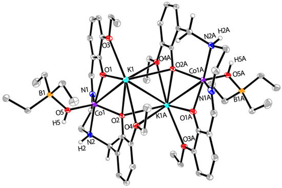 The reduction of salen ligands is a popular way to make new ligands, namely “salan”, with saturated C–N bonds; directly reducing a metal–salen complex is unusual and may lead to unexpected products [42,43,44]. However, we were interested in investigating the reactions of Mn-1 and Co-2 with two reducing agents, potassium triethylborohydride (KHBEt3) and pinacolborane (HBpin), respectively. While the reduction of Mn-1 led to complicated mixtures that could not be isolated and identified, reactions involving Co-2 were carried out with isolable products (see Scheme 2). Thus, reacting a solution of Co-2 with an excess amount of KHBEt3 in THF under inert atmosphere resulted in the switching from a dark red into a light red solution, from which red crystals of CoK-3 were isolated upon evaporation in an appreciable yield (62%). The structure of CoK-3 can be regarded as a novel dimer of Co-K bimetallic complexes with partially reduced salen ligands, as shown in Scheme 2. Its structure was unambiguously identified by X-ray crystallography and also characterized by elemental analysis, UV-Vis absorption, and IR spectroscopies, although its solution NMR spectrum showed a paramagnetic nature (Figure S11). Compound CoK-3 crystallizes in the triclinic space group P-1, and its X-ray structure is presented in Figure 3, which reveals a centrosymmetrical dimer. Two reduction events occurred upon reacting with KHBEt3. First, the salen ligand was partially reduced at only one of the imine bonds by KHBEt3 and water (originally from Co-2). Supporting water as a hydrogen source, the anionic byproduct Et3B(OH)− formed during the reduction process acted as a new axial ligand in CoK-3. Second, the original Co(III) center was turned to Co(II) via a one-electron reduction by extra KHBEt3. Although it is well known that KHBEt3 is usually employed to reduce metal complexes for the preparation of metal hydride complexes, [45,46,47] the reduction of Co(II) to Co(I) by KHBEt3 has also been observed during the synthesis of cobalt(I) cyclopentadienyl–phosphine dinitrogen complexes [48]. In addition, K+ sits in the O4 cavity of one ligand and further coordinates to two extra O atoms from another ligand, leading to the formation of a larger dimeric complex.