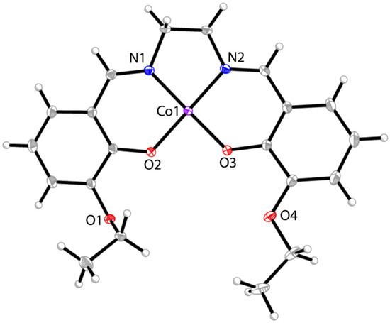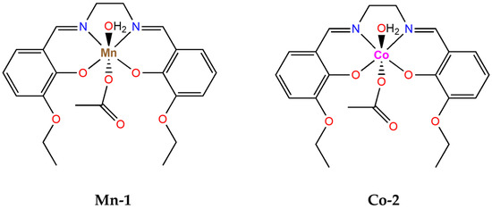 Manganese(III) and cobalt(III) complexes (Mn-1 and Co-2) were readily synthesized in high yields by the one-pot reactions of two equiv. of 3-ethoxysalicylaldehyde and one equiv. of 1,2-diaminoethane with manganese(II) or cobalt(II) acetate at room temperature in the air, respectively. X-ray quality crystals of both complexes were obtained after slow evaporation of a CH2Cl2-MeOH solution over a week. The crystals of both compounds show poor solubility in common organic solvents such as CH2Cl2, CHCl3, MeOH, CH3CN, or THF, yet they are well soluble in DMSO. The complexes were characterized by UV-Vis and FT-IR spectroscopies, high-resolution mass spectrometry, solution NMR spectroscopy, and elemental analysis. Although the 1H NMR spectrum of compound Co-2 in DMSO-d6 shows broad signals due to its paramagnetic characteristics (Figure S8), Mn-1 displays well-resolved NMR signals in solution, and its 1H and 13C NMR spectroscopic data are consistent with the structure as drawn in Scheme 1 (Figures S9 and S10, see Supplementary Materials). The deprotonation of the hydroxyl group in Mn-1 when coordinated to Mn has been proven by its 1H NMR spectrum due to the disappearance of the OH signal at 13.54 ppm, as observed in that of the free ligand. In addition, all other proton signals show significant shifts compared to those of the ligand alone (Figures S6 and S9).