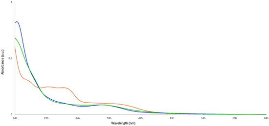 The UV-Vis spectra of compounds Mn-1 (blue), Co-2 (red), and CoK-3 (green) in H2O/DMSO (v/v = 100:1, c = 1 × 10−5 M).