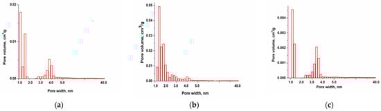 Pore size distribution [17] data are presented in Figure 2a–c and the results show the presence of micropores in the range of 1.5–2.0 nm and mesopores in the range of 2.0–3.0 nm.