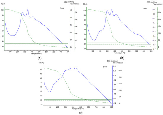 The differential thermogravimetry and differential scanning calorimetry of carbon materials provided valuable data regarding the type of ongoing processes during heat treatment (Figure 3). The DSC and TG profiles show different processes taking place during the temperature treatment (20–900 °C) of the sample. The data show that the thermal destruction of peach stones occurs more slowly and at higher temperatures compared to olive and plum stones. Olive stones are destroyed faster and at a lower temperature. This is due to the different textures of biomass materials. It is more dense in the case of peach stones, and more loose in the case of olive stones. These differences in the behavior of different raw materials when heated are clearly shown by the DSC analysis. The exo effects that are reported at 280 and 320, and 360 and 380 °C, respectively, for olive and plum stones, are due to the synthesis reactions (proceeding with the release of heat) with the participation of radicals obtained from the destruction of the organic mass of these stones. For peach stones, these peaks are very weakly expressed due to the small amounts of radicals derived from their organic mass [18].