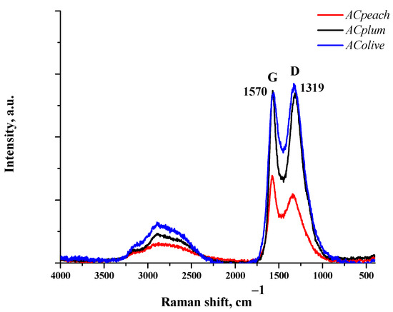 The results from Raman spectroscopy show that the amount of disordered carbon structures increases in the order of AColive < ACplum < ACpeach, according to the rise of the BET surface area.