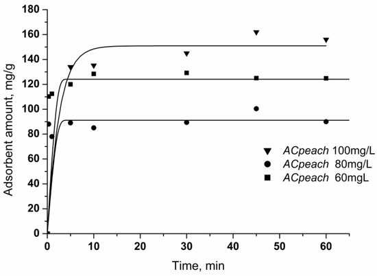 The kinetic curves in Figure 6 show the adsorption of chlorhexidine gluconate on the synthesized activated carbons from solution with concentrations of 60–100 mg/L. Chlorhexidine gluconate adsorption increases sharply at a short contact time. The adsorption process is quite fast and efficiently illustrates that the adsorption of chlorhexidine gluconate is completed almost on the whole surface of activated carbons. Saturation of the activated carbon surface with the largest surface area occurs after a longer time.