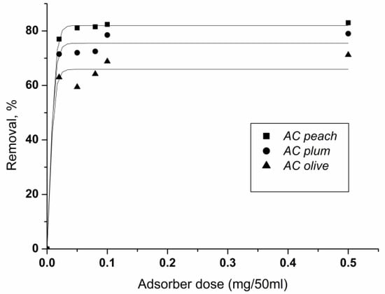 Effect of carbon dosage on the removal of chlorhexidine gluconate adsorption onto ACpeach, AColive, and ACplum. Conditions: adsorbent amount 0.02–0.5 g per 50 mL solution, concentration 100 mg/L, time of treatment 60 min, 25 °C.