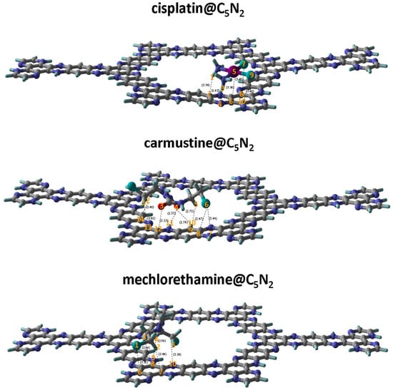 Stable geometries of the cisplatin@C5N2, carmustine@C5N2, and mechlorethamine@C5N2 complexes highlighting interacting atoms and their respective bond lengths (represented by spotted lines) between the drugs and the C5N2 sheet.