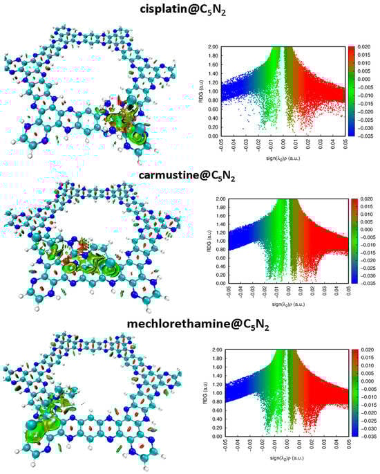 The 3D isosurface and 2D RDG plot highlighting non-covalent interactions between the drugs and the C5N2 substrate. The red color highlights regions of stearic hindrance, the green color indicates areas of van der Waals interactions, and the blue color represents hydrogen bonding zones.