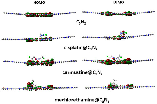 Spatial distribution of the HOMO−LUMO of the bare C5N2 sheet along with the drug@C5N2 complexes.