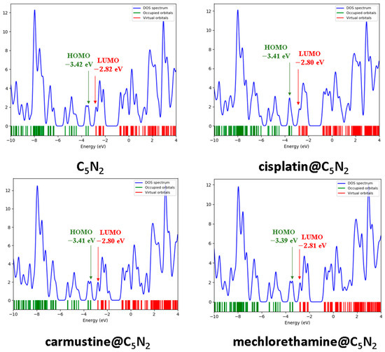 Graphical illustration of DOS spectra highlighting the HOMO−LUMO energy gap of the bare C5N2 sheet and drug@C5N2 complexes.