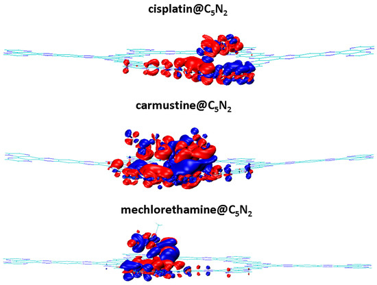 The portrayal of the electron density distribution of cisplatin@C5N2, carmustine@C5N2, and mechlorethamine@C5N2 complexes. The red color represents the electron density accumulated region while the blue color is related to the electron density depleted region.