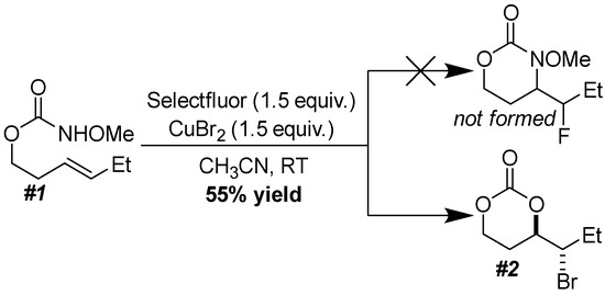 Of course, none of what we had drawn on paper transpired in the flask. Instead, bromo carbonate 2 was the only isolable product (Scheme 1). We were very excited by this result, as olefin halo-functionalization with tethered O- or N-nucleophiles is useful for regioselectively and diastereoselectively constructing heterocycles of importance [12,13,14,15,16,17,18,19,20,21,22,23,24,25]. In this area, prior work with carbamate tethers has largely focused on iodination reactions [26,27,28,29,30,31,32,33,34,35,36,37], with comparatively fewer reports on analogous brominations [38,39,40,41,42,43,44,45,46]. There are no reports examining the use of N-alkoxycarbamate tethers for olefin halo-functionalizations; indeed, these unusual auxiliaries are underutilized for organic synthesis in general [11,47,48,49]. For these reasons, we felt that this serendipitous discovery was worth further exploration.