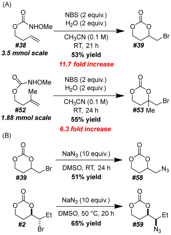 Even with six-fold and twelve-fold increases in scale (Scheme 4A), products were formed in reasonable yields. With product 39, which contains a primary alkyl bromide moiety, substitution with sodium azide proceeded at room temperature (Scheme 4B). Unsurprisingly, with 2, an analogous transformation required mild heating. In both cases, an excess of sodium azide was required for starting material consumption.