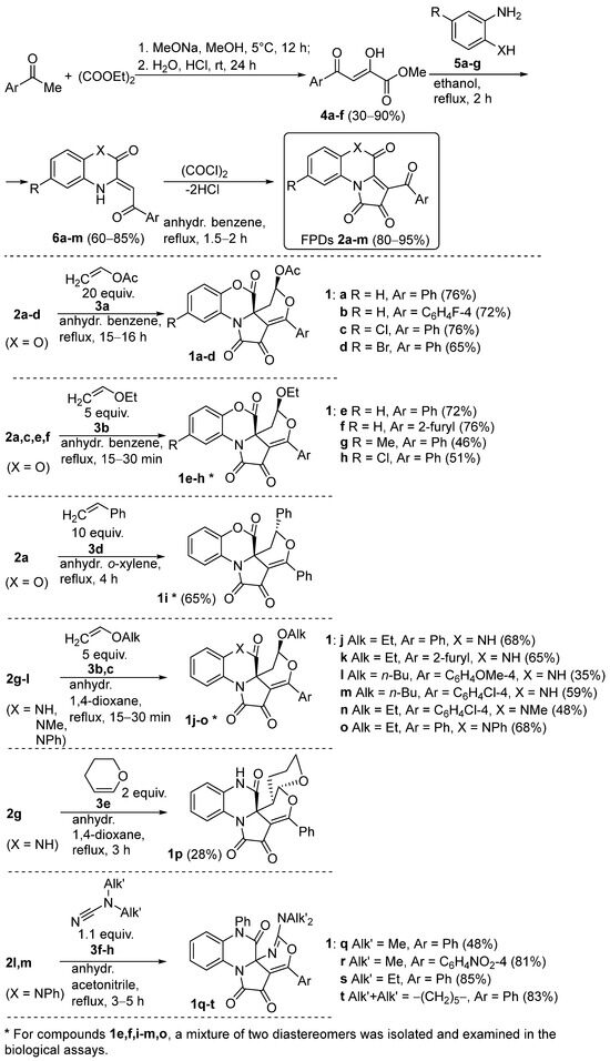 - Kasatkina, S.O.; Titov, M.S.; Stepanova, E.E.; Dmitriev, M.V.; Maslivets, A.N. Synthesis of Pyrano[4′,3′:2,3]pyrrolo[1,2-a]quinoxalines by Reaction of Aroylpyrroloquinoxalines with Alkyl Vinyl Ethers. Russ. J. Org. Chem. 2018, 54, 626–632. [Google Scholar] [CrossRef]