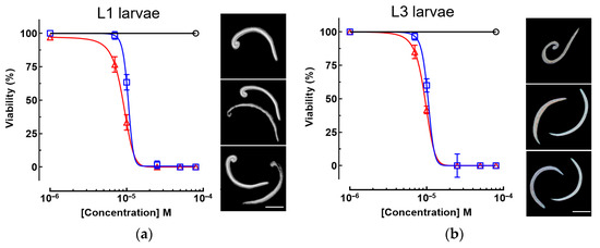 Consistent with these potency metrics, piplartine induced a concentration-dependent reduction in larval viability, with near-complete immobility observed at concentrations as low as 10 µM for L1 (Figure 2a). In contrast, albendazole required higher concentrations to achieve comparable effects, further highlighting piplartine enhanced efficacy. Similar trends were observed for L3, for which piplartine dose–response curve demonstrated steeper declines in viability compared to albendazole (Figure 2b). In both stages, larvae exposed to piplartine or albendazole exhibited pronounced morphological alterations—particularly in the caudal region—including shrinkage and surface disruption (Figure 2).