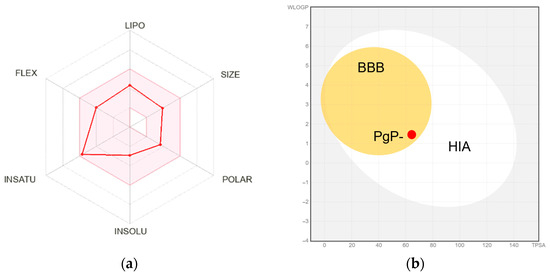Drug-likeness and pharmacokinetic profiling of piplartine. (a) Bioavailability radar analysis of piplartine, depicting key physicochemical properties (lipophilicity, molecular size, polarity, solubility, flexibility, and saturation) within ideal ranges for oral bioavailability. (b) Dual evaluation of passive gastrointestinal absorption (HIA) and blood–brain barrier (BBB) permeability. The white region represents a high probability of passive gastrointestinal absorption (HIA), while the yellow region (yolk) indicates high BBB penetration potential. The red data point reflects piplartine classification as a non-substrate of P-glycoprotein (PgP-). Predictions were based on the molecule’s position in the WLOGP (lipophilicity) vs. TPSA (topological polar surface area) reference space.