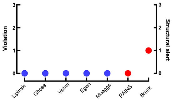 Drug-likeness compliance with established pharmaceutical criteria (blue): Lipinski (Pfizer), Ghose (Amgen), Veber (GSK), Egan (Pharmacia), and Muegge (Bayer). Blue indicates adherence to all five criteria. Structural risk assessment (red) using PAINS (pan-assay interference compounds) and Brenk (structural toxicity alerts) filters. A Brenk alert identifies a Michael acceptor moiety, a structural feature associated with potential electrophilic reactivity and off-target effects.