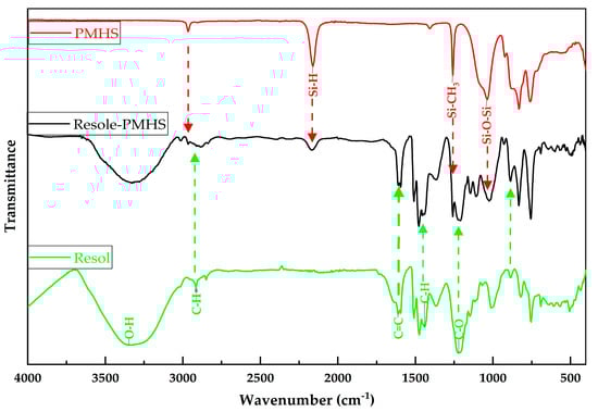 Figure 1 presents the Fourier-transform infrared (FTIR) spectra of pure polymethylhydrosiloxane (PMHS), unmodified resol resin (neat resol), and resol resin modified with 2.5 wt% PMHS (Resol–PMHS).
