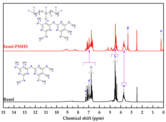The proton nuclear magnetic resonance (1H NMR) spectra of the unmodified resol resin (neat resol) and the PMHS-modified resol resin (Resol–PMHS) are presented in Figure 2.