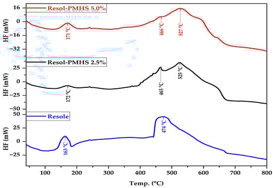 To evaluate the effect of PMHS modification on the thermal characteristics of the resol resin, Differential Scanning Calorimetry (DSC) measurements were performed. The DSC curves for the neat resol resin and samples modified with 2.5% and 5.0% PMHS are presented in Figure 3.