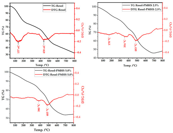 Thermogravimetric analysis (TGA) and derivative thermogravimetry (DTG) curves of neat resol, Resol–PMHS 2.5%, and Resol–PMHS 5.0%.