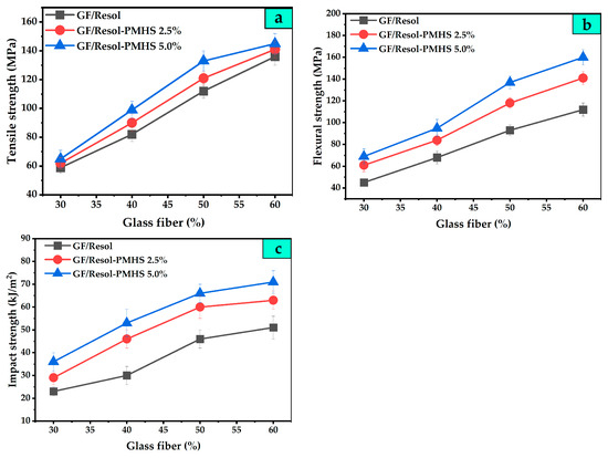 To evaluate the role of polymethylhydrosiloxane (PMHS) in enhancing the mechanical properties of resol resin-based composites, the tensile strength, flexural strength, and Izod impact strength of composites containing varying glass fiber (GF) content (30–60 wt%) were determined (Figure 5).