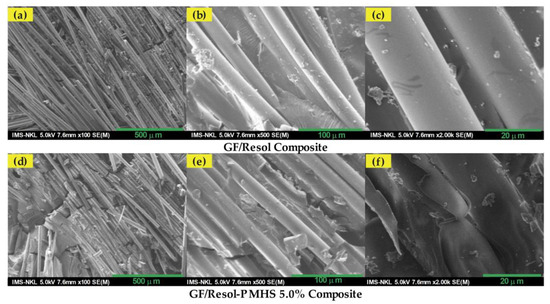 SEM images of GF/Resol (a–c) and GF/Resol–PMHS 5.0% (d–f) composites at 500 µm, 100 µm, and 20 µm.