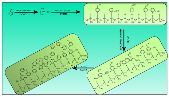Synthesis of PMHS-Modified Resol Resin: The synthesis procedure for PMHS-modified resol resin (Scheme 1) was similar to that for neat resol resin, with a key modification. Specifically, after the initial 1 h reaction period at 80 °C (between phenol and 20.8 g of formaldehyde) and before the addition of the remaining 40.0 g of formaldehyde solution, a pre-calculated amount of polymethylhydrosiloxane (PMHS) (corresponding to 2.5 wt% and 5.0 wt% relative to phenol) was slowly added dropwise into the reaction flask under continuous stirring. The mixture was then maintained at 80 °C for 1 h to facilitate the reaction of PMHS. Subsequently, the remaining 40.0 g of formaldehyde solution was added, and the remaining synthesis steps, including the vacuum distillation stage, were carried out as described for the neat resol resin synthesis.