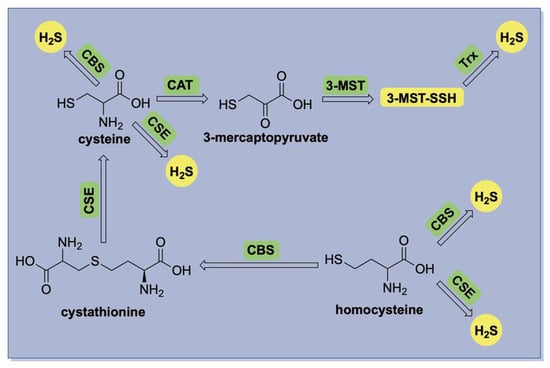 The biosynthesis of hydrogen sulfide (H2S) is primarily mediated by three enzymes: cystathionine-β-synthase (CBS) [20], cystathionine-γ-lyase (CSE) [21], and the 3-mercaptopyruvate sulfurtransferase (3-MST) in conjunction with cysteine aminotransferase (CAT) [22]. A summary of these pathways is illustrated in Figure 1. CBS and CSE are central components of the transsulfuration pathway, facilitating the conversion of homocysteine to cysteine via the intermediate cystathionine. Both enzymes are pyridoxal 5′-phosphate (PLP)-dependent and localized in the cytosol, where they produce H2S through the direct desulfurization of cysteine or homocysteine. In contrast, 3-MST is a PLP-independent enzyme predominantly located in mitochondria, where it catalyzes H2S production using 3-mercaptopyruvate as its substrate.