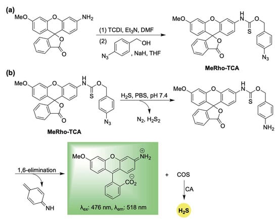 (a) Synthesis of MeRho-TCA. (b) Proposed mechanism for COS/H2S release from MetRho-TCA upon activation by H2S.