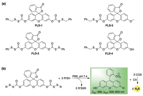 Pluth et al. developed a library of self-reporting H2S donors using fluorescein, which are selectively activated by biological thiols (FLD1–4, Scheme 2a) [57]. Their proposed mechanism involves a thiol–disulfide exchange with cysteine or glutathione, which triggers the uncaging of a sulfenyl thiocarbonate, which spontaneously breaks down to release COS while restoring the fully conjugated fluorescein reporter (Scheme 2b). COS is then transformed into H2S by CA. This design enables real-time tracking of H2S release while preventing the formation of electrophilic byproducts—a common issue among COS/H2S-based donors, which often yield a highly toxic quinone methide as a byproduct [58,59,60]. The authors validated their fluorescence response in the presence of cysteine and CA, and quantified H2S release using the methylene blue assay. For FLD-3, where H2S and fluorescein are released in a 1:1 ratio, a strong linear correlation was observed between fluorescence intensity and H2S concentration (R2 = 0.988), confirming that COS/H2S release can be accurately tracked using the fluorescein reporter. Additionally, the authors demonstrated that the H2S release rate from this series could be modulated by altering disulfide reactivity. Specifically, the more electrophilic phenyl sulfenyl thiocarbonate exhibited a significantly faster response than its benzyl counterpart. As expected, other biologically pertinent thiols—including N-acetylcysteine, homocysteine, and glutathione—were also effective in triggering the release of COS/H2S and fluorescein. Following these buffer-based studies, the H2S-releasing capability of FLD donors was further confirmed in live human cells using a Leica DMi8 fluorescence microscope (Wetzlar, Germany). HeLa cells treated with FLD-1 (50 µM) displayed strong fluorescence in the fluorescein channel, indicating successful cellular uptake, donor activation, and H2S release. Furthermore, FLD-1 demonstrated dose-dependent inhibition of lipopolysaccharide (LPS)-induced nitric oxide (NO) production in RAW 264.7 macrophage cells, highlighting its anti-inflammatory potential. Notably, this effect was absent in other components of the donor, emphasizing the potential role of H2S release in mediating anti-inflammatory responses.
