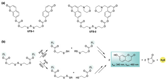 - Mahato, S.K.; Bhattacherjee, D.; Bhabak, K.P. The Biothiol-Triggered Organotrisulfide-Based Self-Immolative Fluorogenic Donors of Hydrogen Sulfide Enable Lysosomal Trafficking. Chem. Commun. 2020, 56, 7769–7772. [Google Scholar] [CrossRef] [PubMed]