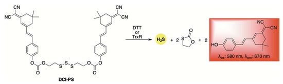 - Mahato, S.K.; Bhattacherjee, D.; Barman, P.; Bhabak, K.P. Thioredoxin Reductase-Triggered Fluorogenic Donor of Hydrogen Sulfide: A Model Study with a Symmetrical Organopolysulfide Probe with Turn-On Near-Infrared Fluorescent Emission. J. Mater. Chem. B 2022, 10, 2183–2193. [Google Scholar] [CrossRef]