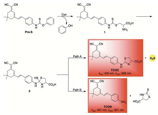 A similar fluorescent reporter was employed by Zhang and co-workers in the development of Pro-S, a self-reporting H2S donor activated by cysteine [63]. A proposed mechanism is depicted in Scheme 5. Initially, the nucleophilic thiol of cysteine likely attacks the carbon–sulfur double bond of Pro-S, displacing phenol and forming intermediate 1. Intramolecular cyclization, driven by the free amine on cysteine, then produces intermediate 2, which can decompose via two competing pathways: one leading to H2S release and formation of the fluorophore TCOC (Path A), and the other yielding the fluorophore TCON without H2S discharge (Path B). Due to these competing pathways, the observed fluorescence signal does not necessarily correlate with H2S release. Nonetheless, similar thiocarbamate and dithiocarbamate-based frameworks have been widely used for cysteine detection in various biological and disease models [64,65]. Their dual functionality—as reporters and H2S donors—adds a valuable dimension to their design. Pro-S proved effective for live-cell imaging, allowing visualization of H2S release in both cellular and zebrafish models. Moreover, it demonstrated potential anti-inflammatory properties, as shown by its ability to suppress pro-inflammatory mediators like TNF-α and IL-6 in RAW 264.7 macrophage cells.