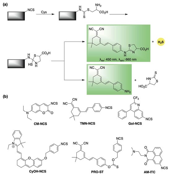 - Zhang, M.; Wang, S.; Fu, Y.; Meng, M.; Jin, H.; Zhao, W. An Isothiocyanate-Functionalized Self-Immolative Near-Infrared Fluorescence Probe for Cysteine Sensing and Bioimaging in Living Systems. Sens. Actuators B Chem. 2022, 366, 132013. [Google Scholar] [CrossRef]